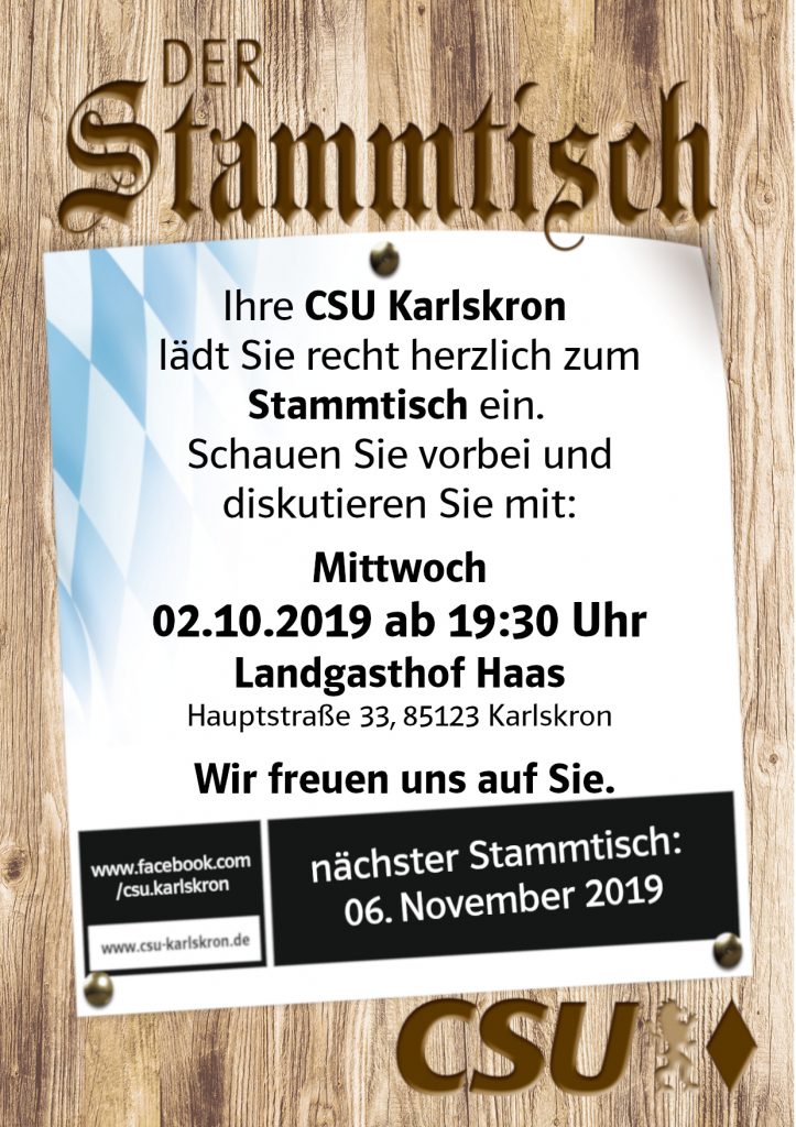 « Alle Veranstaltungen Diese Veranstaltung hat bereits stattgefunden. CSU-Stammtisch 10/19 2. Oktober 2019 @ 19:30 - 22:30 « CSU-Stammtisch 9/19 CSU-Stammtisch 11/19 » Zum Kalender hinzufügen Google Kalender iCalendar Outlook 365 Outlook Live Details Datum: 2. Oktober 2019 Zeit: 19:30 - 22:30 Veranstaltungsort Landgasthof Haas Hauptstrasse 33 Karlskron, Bayern 85123 Deutschland Google Karte anzeigen Telefon 08450 8213 Veranstaltungsort-Website anzeigen