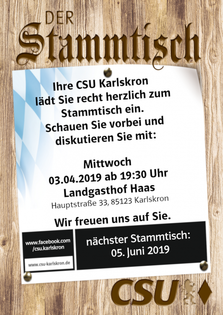 « Alle Veranstaltungen Diese Veranstaltung hat bereits stattgefunden. CSU-Stammtisch 4/19 3. April 2019 @ 19:30 - 22:30 « Politischer Aschermittwoch: Fahrt nach Passau Prof. Dr. Angelika Niebler kommt nach Pobenhausen » Zum Kalender hinzufügen Google Kalender iCalendar Outlook 365 Outlook Live Details Datum: 3. April 2019 Zeit: 19:30 - 22:30 Veranstaltungsort Landgasthof Haas Hauptstrasse 33 Karlskron, Bayern 85123 Deutschland Google Karte anzeigen Telefon 08450 8213 Veranstaltungsort-Website anzeigen